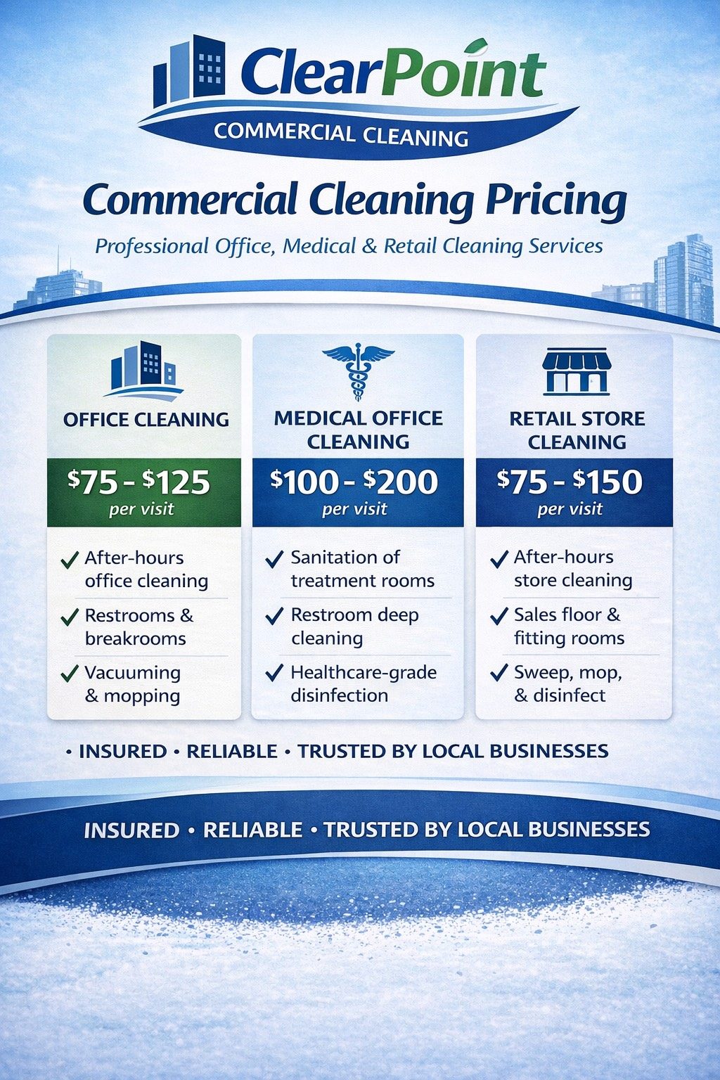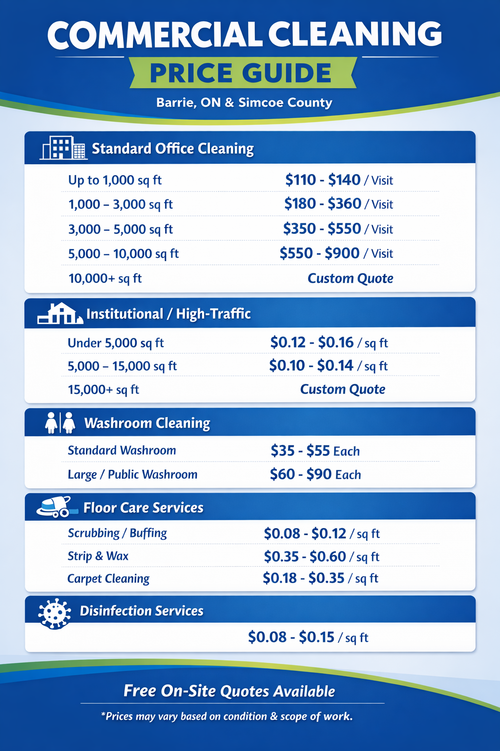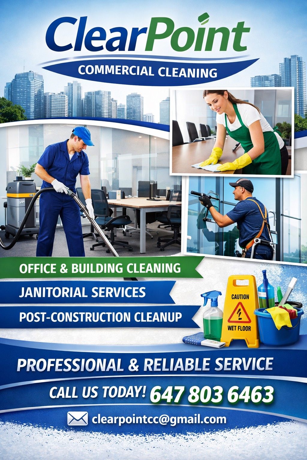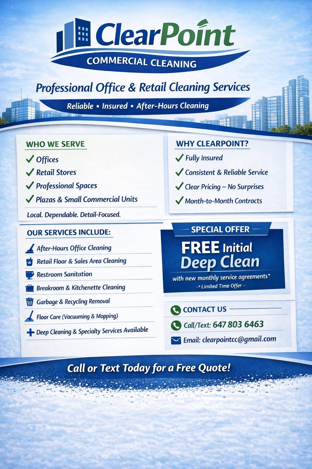 Clearpoint Commercial Cleaning provides dependable, detail-focused cleaning services for offices, institutions, and commercial facilities throughout Barrie and Simcoe County. From routine janitorial services and washroom sanitation to floor care and high-touch disinfection, we help businesses maintain clean, healthy, and professional environments. Our customized cleaning plans, reliable team, and commitment to quality ensure your space always makes a strong first impression.